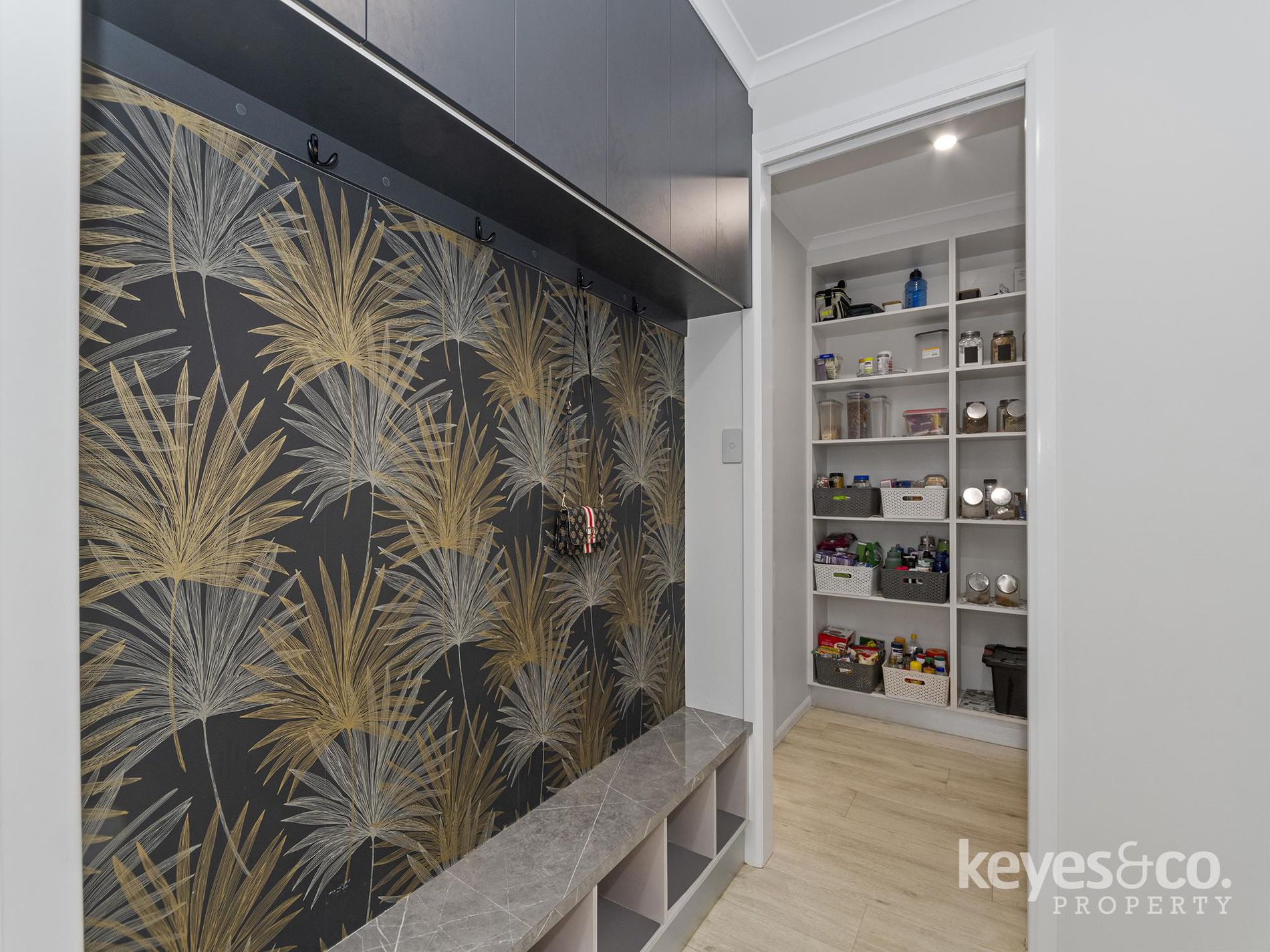 - Dedicated mud room with built-in storage, bench seating, and feature wallpaper