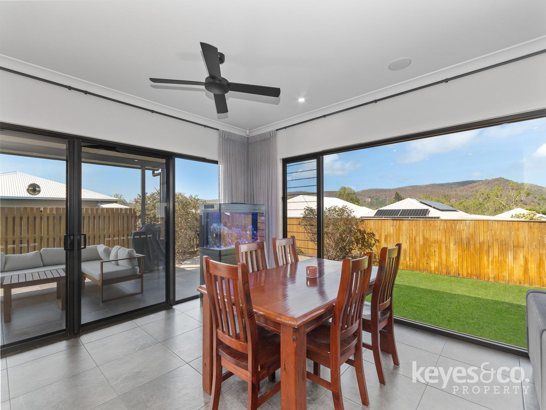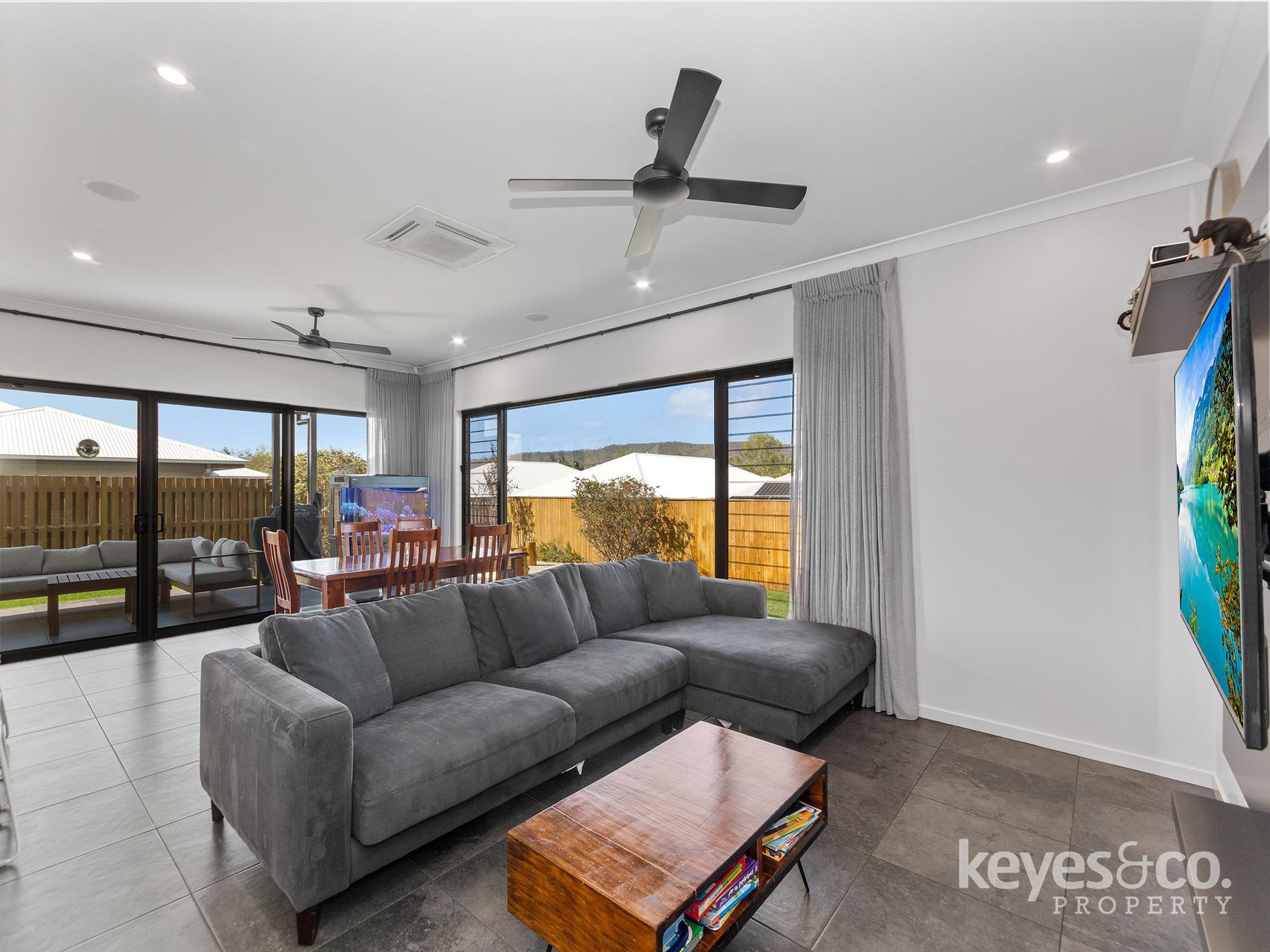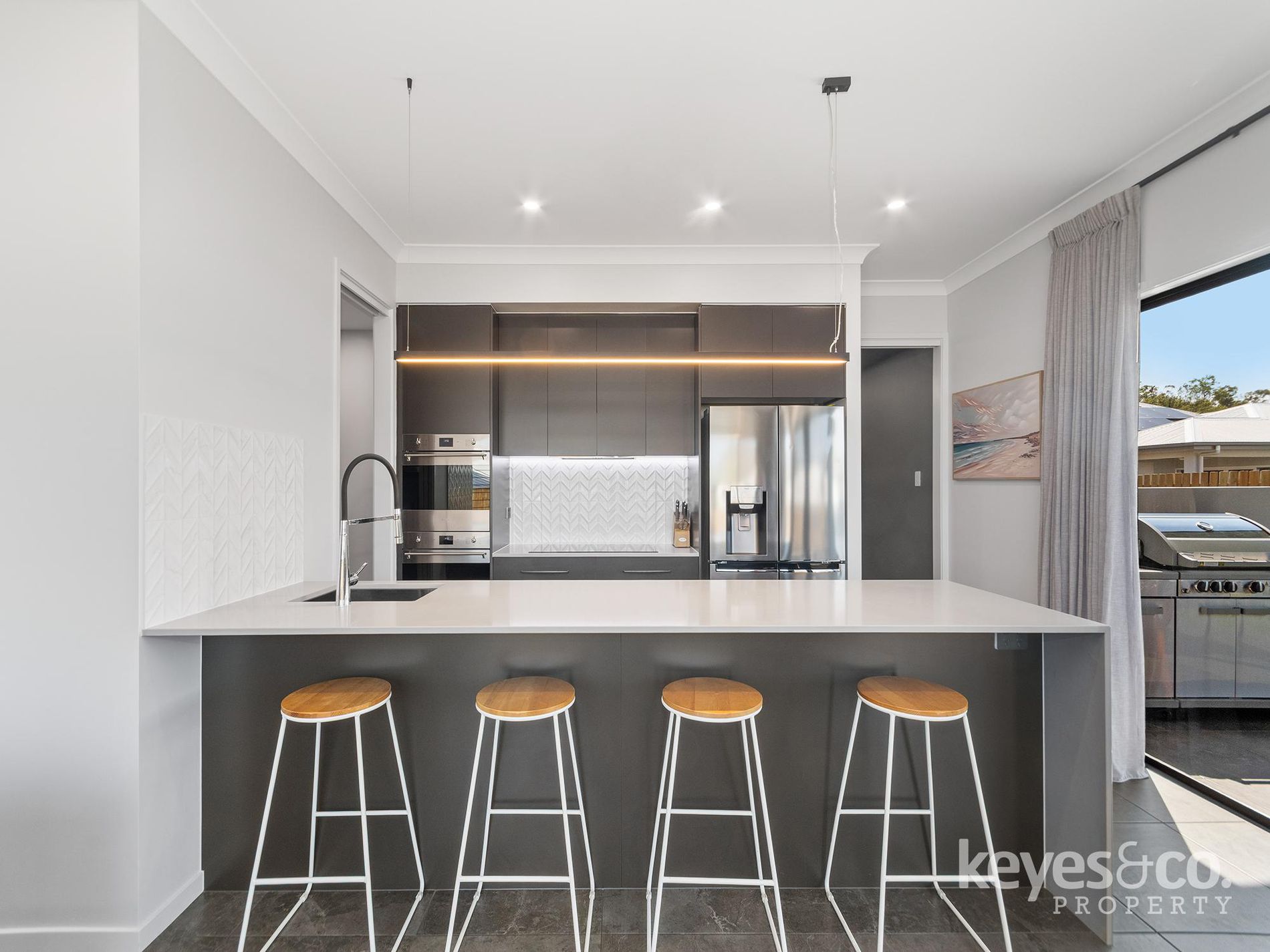 - Open plan living, dining, and kitchen zones connect effortlessly to the outdoors
